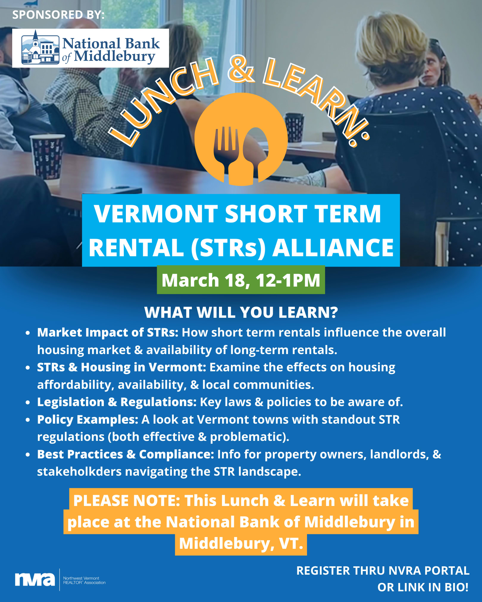Join us for an informative Lunch & Learn session where we dive into the evolving landscape of short-term rentals (STRs) and their impact on Vermont’s housing market. Whether you're a property owner, real estate professional, policymaker, or simply interested in the future of housing in our state, this session will provide valuable insights into the opportunities and challenges surrounding STRs.